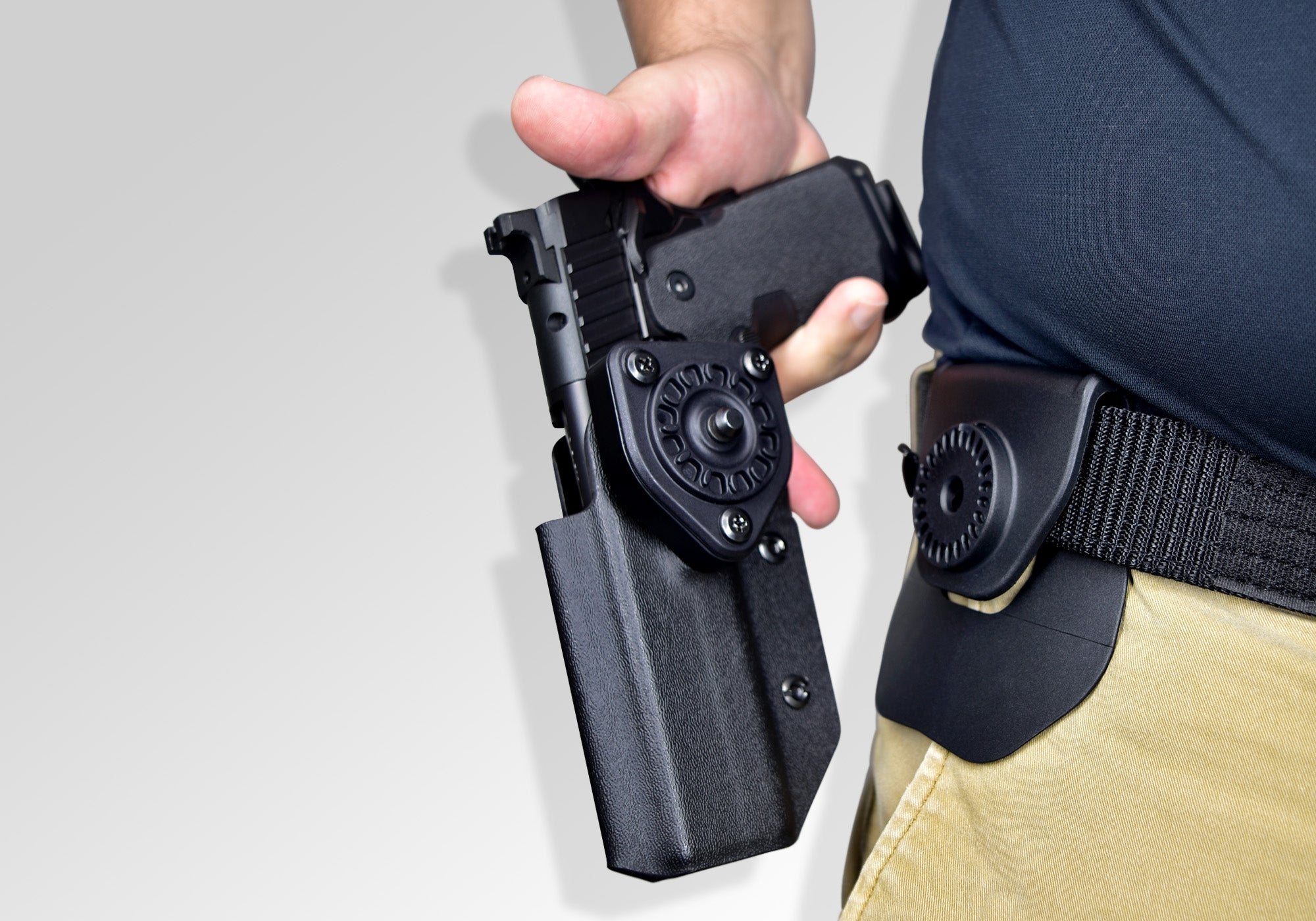 Quickly attach or detach your holster to the Paddle belt attachment without removing your belt.